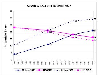 In contrast, from 1990 to the present China’s percentage share of the world’s GDP grew from 4% to its present level and is projected to increase to 18% by 2020. China’s position to set limits on the “intensity” of CO2 emissions as a percentage of GDP does not reduce emissions, but rather the rate at which emissions grow.